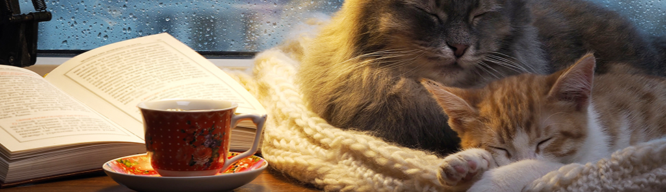 Uwe Annas, Cats sleeping in the window. Outside, rain, water drops on the glass. Twilight, included a desk lamp. It should be a cup with a drink, it is an open book. Cozy and warm © kozorog,